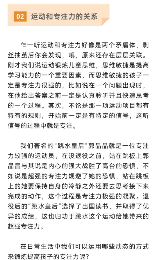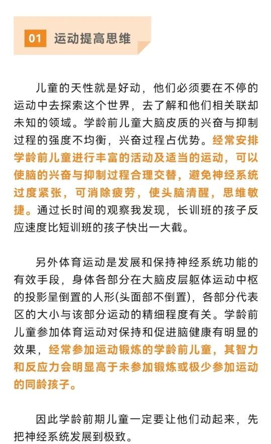 家長們對孩子專注力問題心急如焚的狀態完全可以理解,不過呢從發展心理學的角度來看,低年齡段孩子專注力差是屬于正常現象,隨著年齡增長,孩子的專注力會越來越好。心理學家桑德拉博士的團隊研究發現,3-5歲是孩子“執行能力”的快速發展期,7歲后定型。而執行能力便是孩子對思想及肢體動作進行有規劃的控制心理過程,也就是我們平時所說的專注力和自制能力。所以家長朋友們我們也不必太過焦慮啦。